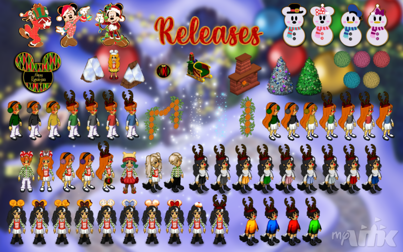Items Released: Holiday PJs - Mickey, Holiday PJs - Minnie, Holiday PJs - Goofy, Snowman - Mickey, Snowman - Minnie, Snowman - Donald, Snowman - Daisy, Mickey Head - Kwanzaa, Snowy Roof - 1x1, Snowy Roof Corner - Corner, Heavy Snowy Roof - 1x1, Heavy Snowy Roof - Corner, Cozy Village Fireplace, Green Yarn Chair, Pink Yarn Chair, Red Yarn Chair, Yellow Yarn Chair, Teal Yarn Chair, Glowing Snow Pillar - White, Glowing Snow Pillar - Blue, Lantern - Kwanzaa, Orange Slice Pillar, Orange Slice Garland, Mickey Headband - Sufganiyot, Minnie Headband - Sufganiyot, Little Sufganiyot, Yummy Gelt Treat, Holiday Pleated Skirt - Black, Holiday Pleated Skirt - Blue, Holiday Pleated Skirt - Coal, Holiday Pleated Skirt - Gold, Holiday Pleated Skirt - Green, Holiday Pleated Skirt - Red, Holiday Pleated Skirt - Icy Pink, Holiday Pleated Skirt - Misty Lavender, Holiday Pleated Skirt - Pale Blue, Ombre Sweater - Yellow, Ombre Sweater - Blue, Ombre Sweater - Red, Ombre Sweater - Green, Mickey Headband - Gelt Treat (Monched), Minnie Headband - Gelt Treat (Monched), Mickey Headband - Santa’s Cookies, Minnie Headband - Santa’s Cookies, Mickey Headband - Gelt Treat, Minnie Headband - Gelt Treat, Hair - Cinnamon Spice, Hair - Cinnamon Sugar, Beanie - Pooh, Holdable - Kwanzaa Lantern, Mickey Ears - Peppermint, Minnie Ears - Peppermint, Cropped Long Sleeve - Red & White, Cropped Long Sleeve - Green & White, Cropped Long Sleeve - Blue & White, Cropped Long Sleeve - Black & White, Long Sleeve - Red & White, Long Sleeve - Green & White, Long Sleeve - Blue & White, Long Sleeve - Black & White, Cropped Turtleneck - Green, Cropped Turtleneck - Black, Cropped Turtleneck - Yellow, Turtleneck - Green, Turtleneck - Black, Turtleneck - Yellow, Winter Earmuffs - Black, Winter Earmuffs - Green, Winter Earmuffs - Yellow, Winter Earmuffs - Pink, Winter Earmuffs - Purple.