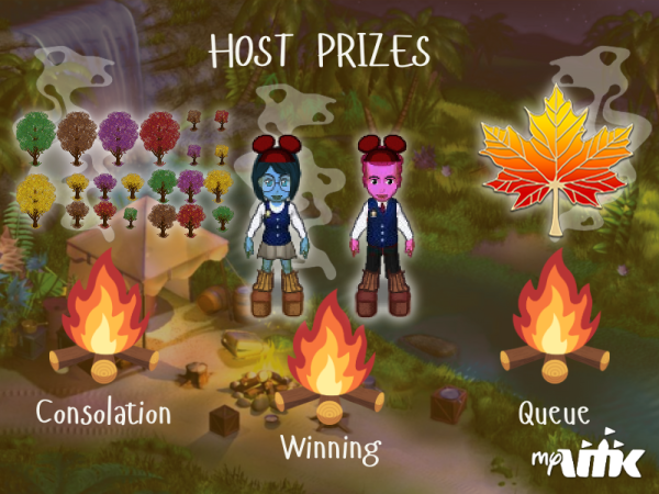 This week, be sure to try your luck at winning our HOST prize, Cozy Platforms - Chestnut or Cozy Platforms - Chocolate. Those who do not win will still receive a Choose Your Own Autumn Tree (1 of 4 tree bundle variations). And for those who do not make it into the game, everyone in the queue will be awarded a Maple Leaf - Red (Pin).