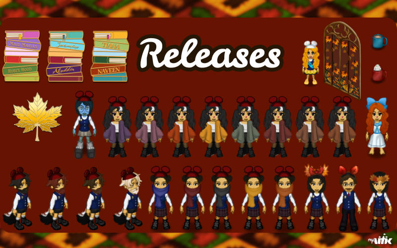 Items Released: Book Season - Maid Marian & Robin Hood, Book Season - Jasmine & Aladdin, Book Season - Tiana & Naveen, Maple Leaf - Yellow, Stained Glass - Autumn Leaves, Mug - Hot Cocoa, Mug - Coffee, Hair - Anastasia, Dreaming of Fall Anastasia - Bow, Dreaming of Fall Anastasia - Shirt, Dreaming of Fall Anastasia - Skirt, Lumberjack Beard - Blonde, Lumberjack Beard - Ginger, Lumberjack Beard - Brown, Lumberjack Beard - Black, Baggy Cardigan - Chocolate, Baggy Cardigan - Chestnut, Baggy Cardigan - Coffee, Baggy Cardigan - Mustard, Baggy Cardigan - Pumpkin, Baggy Cardigan - Mauve, Baggy Cardigan - Sage Green, Baggy Cardigan - Plum, Cozy Platforms - Black and White, Fall Leaf Crown, Oversize Scarf - Blue, Oversize Scarf - Burgundy, Oversize Scarf - Charcoal, Oversize Scarf - Mustard, Oversize Scarf - Orange, Fall Leaf Headband - Hers, Fall Leaf Headband - His.