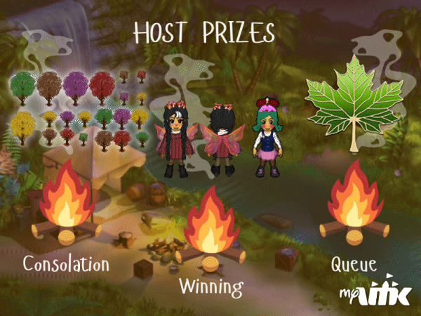 This week, be sure to try your luck at winning our HOST prize, Headband - Autumn Fairy Circle, Wings - Autumn Fae, Turtleneck and Knit Sweater - Dusty Rose, or the chaser prize, Makeup - Bashful. Those who do not win will still receive a Choose Your Own Autumn Tree (1 of 4 tree bundle variations). And for those who do not make it into the game, everyone in the queue will be awarded a Maple Leaf - Green (Pin).