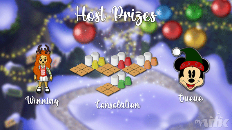 This week, be sure to try your luck at winning our HOST prize, Reindeer Antlers, Reindeer Antlers - Rudolph, Reindeer Antlers - Vixen (1 chosen randomly). Those who do not win will still receive a Choose Your Own Holiday Bundle (1 of 4 bundle variations) x2 Dots (Green, Red, Orange, or Yellow), x2 Marshmallow Chair, x4 1x1 Cookie Floor. And for those who do not make it into the game, everyone in the queue will be awarded a Elf - Mickey (Pin).