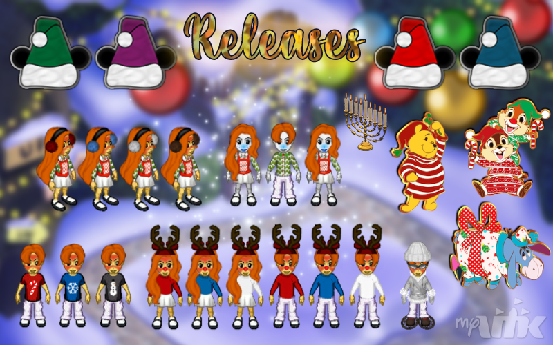 Items Released: Santa Hat Mickey - Red, Santa Hat Mickey - Green, Santa Hat - Blue, Santa Hat - Purple, Holiday PJs - Eeyore, Holiday PJs - Pooh Bear, Holiday PJs - Chip and Dale, Expedition Everest White Jacket, Expedition Everest White Cap, T-Shirt - Candy Cane, T-Shirt Snowflake, T-Shirt Snowman, Makeup - Frost Bitten Nose, Makeup - Frost Bitten Nose (w/ Freckles), Makeup - Frost Bitten Nose (w/ Lipstick), Cropped Turtleneck - Red, Cropped Turtleneck - Blue, Cropped Turtleneck - White, Turtleneck - Red, Turtleneck - Blue, Turtleneck - White, Winter Earmuffs - Red, Winter Earmuffs - Blue, Winter Earmuffs - White, Winter Earmuffs - Brown, Menorah Large - Toggleable.
