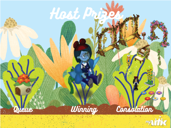 This week, be sure to try your luck at winning our HOST prize, Mount -Blue Flower. Those who do not win will still receive a consolation prize of their own choice (Flower Cushion - (White, Red , Blue, Purple, Yellow, Pink), Sunflower and Pansy Trellis, Flower Arch, Faerie Swing, Faerie Mailbox, Flower Vine, Woodsy Piano, Woodsy Piano Bench). And for those who do not make it into the game, everyone in the queue will be awarded a Miniature Fairy House 2 (Furni).
