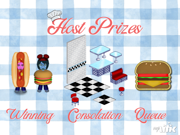 This week, be sure to try your luck at winning our HOST prize, Costume - Cheeseburger or Costume - Hotdog Onesie" (one at random). Those who do not win will still receive your choice of a Diner Tile Small, Diner Tile Large, Diner Booth, Diner Stool, Diner Small Table, Diner Chair, Diner Table, Diner Flat, Diner Counter. And for those who do not make it into the game, everyone in the queue will be awarded a Cheeseburger Pin.